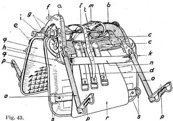 Beim Basten wird durch den in die Ringstücke (s) die Verbindungsriemen eingeschnallten und macht die Verbindung Sattel und Brustblatt, hinten bildet der Rückhaltriemen 1.3 m die Verbindung zwischen Hintergeschirr und Bastsattel.
