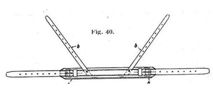 Das Vorderzeug ist mittelst der Tragriemen so anzupassen, dass das Brustblatt möglichst hoch über dem Buggelenken der Vorderbrust leicht anliegt. Das Einschnallen in der Weite hat so zu geschehen, dass beim Kürzerschnallen zum Bergauflaufen nicht infolge zu enger Normalschnallung ein Druck auf vorspringenden Teil der Luftröhre und somit Behinderung das Saumtieres in der Arbeit entsteht.
